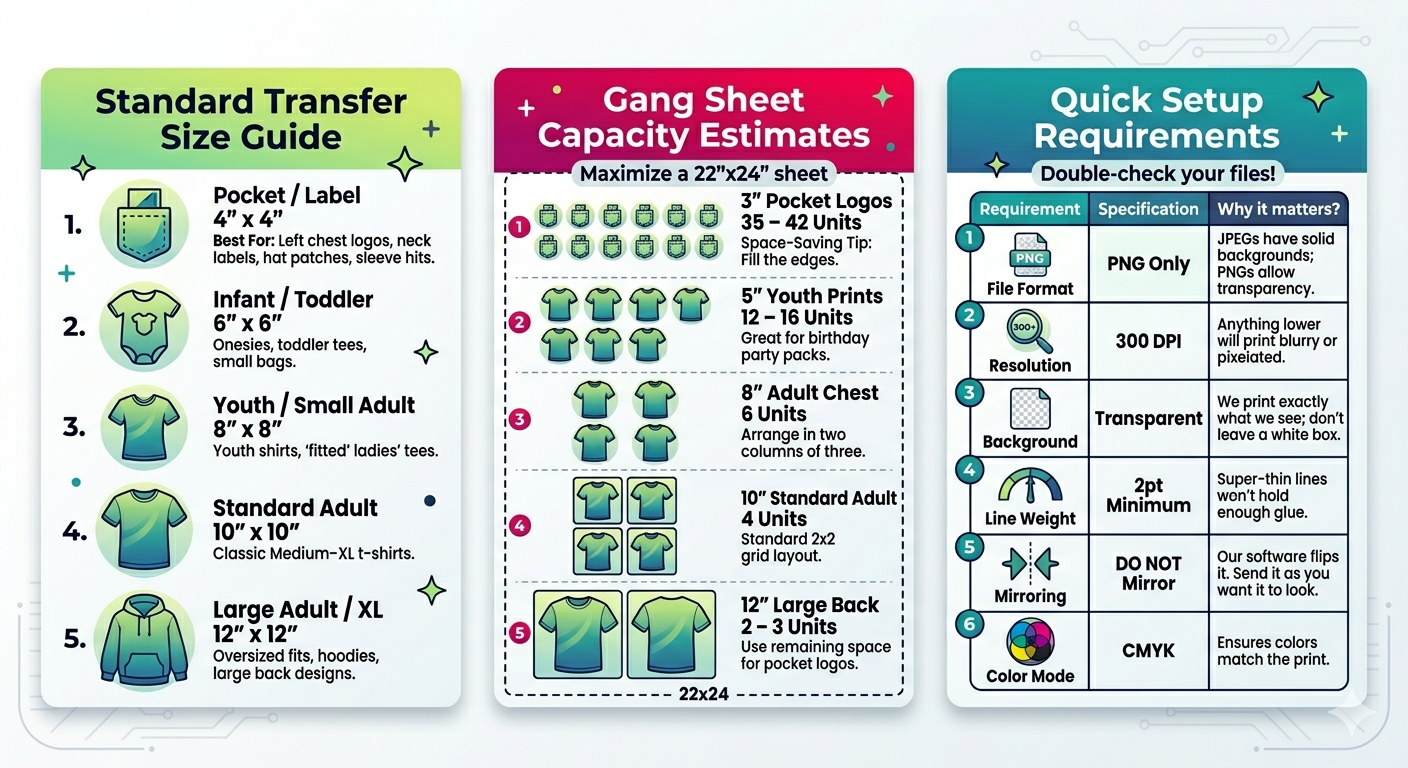 • Cost-Effective Efficiency: We offer tiered pricing to support both small hobbyists and high-volume brands. For the best value, choose our "Gang Sheet" option, which allows you to group multiple designs onto a single roll of film.
